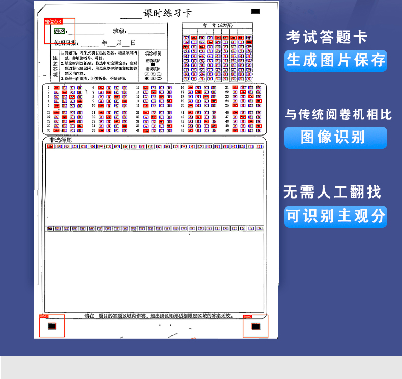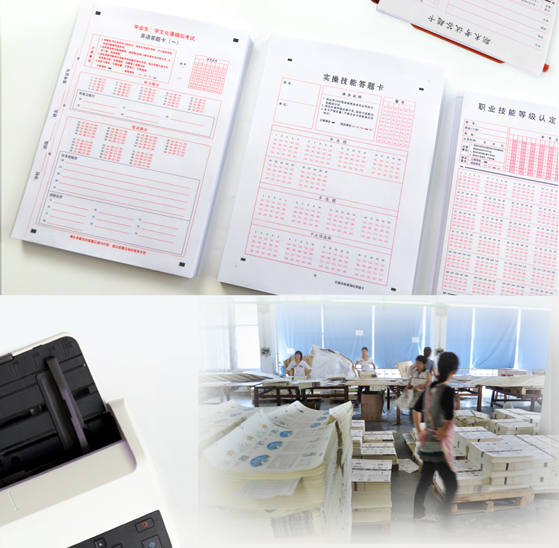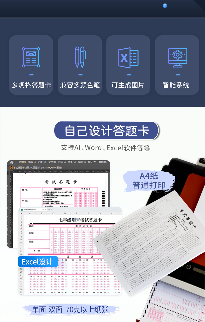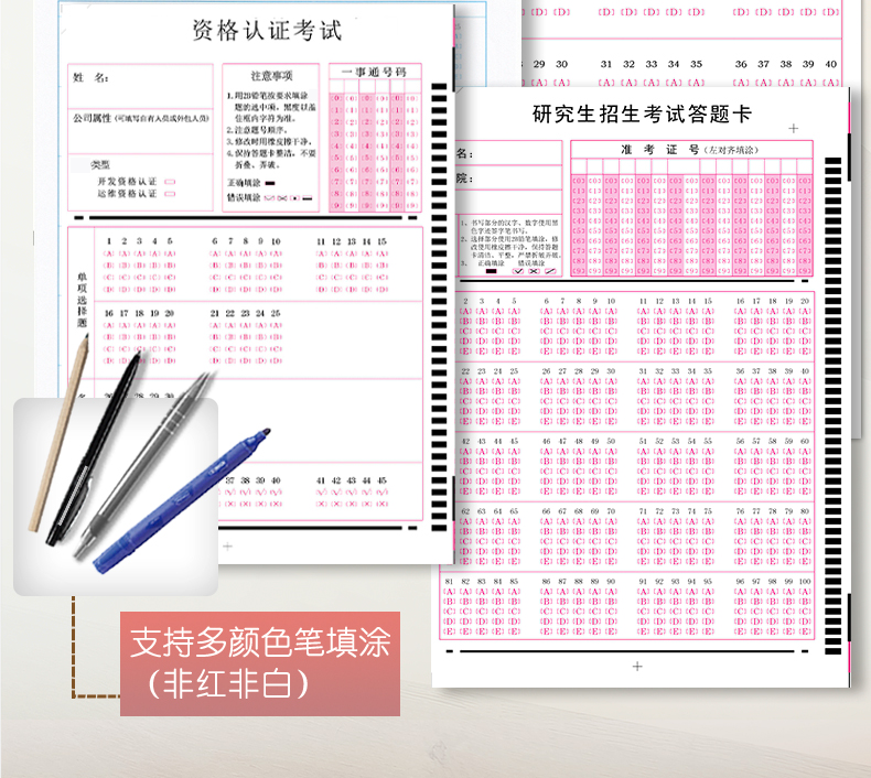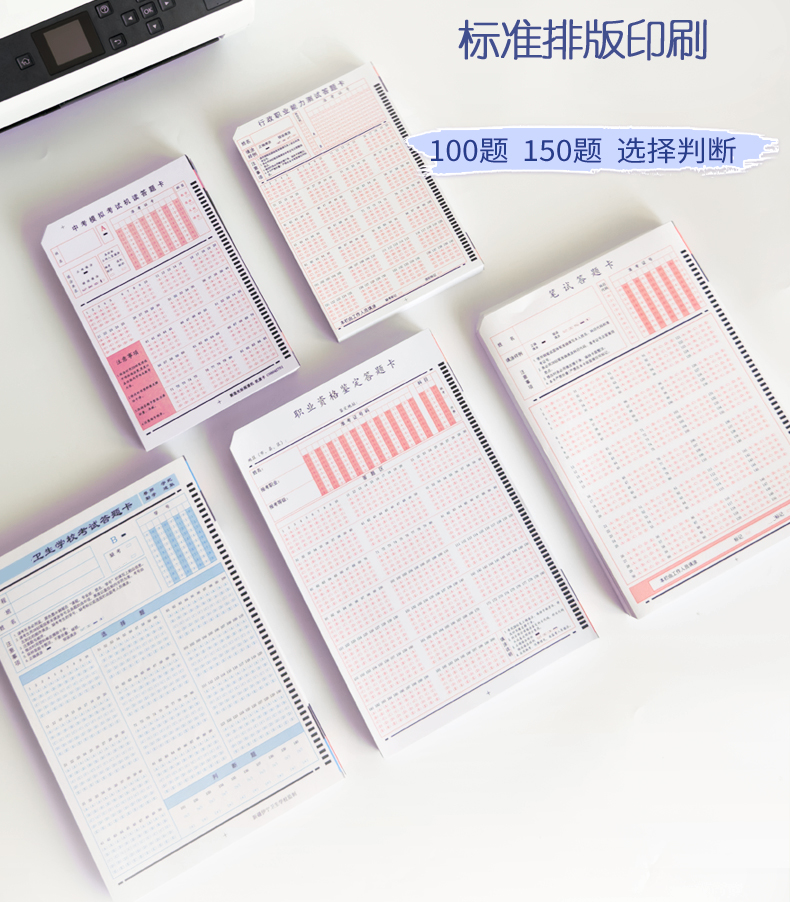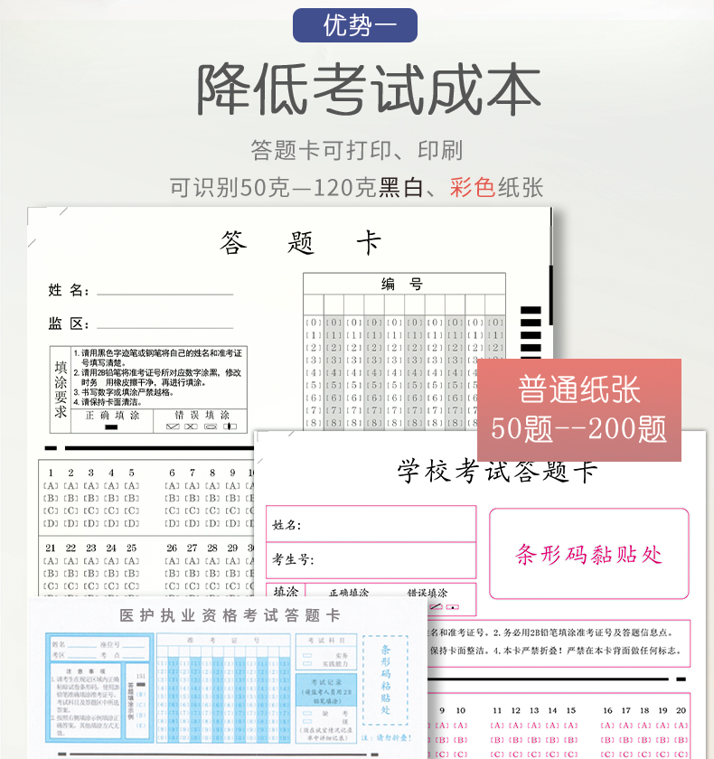 4、支持60克以上紙張,支持各種顏色印刷、打印、復(fù)印的答題卡