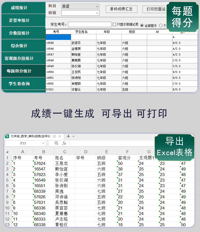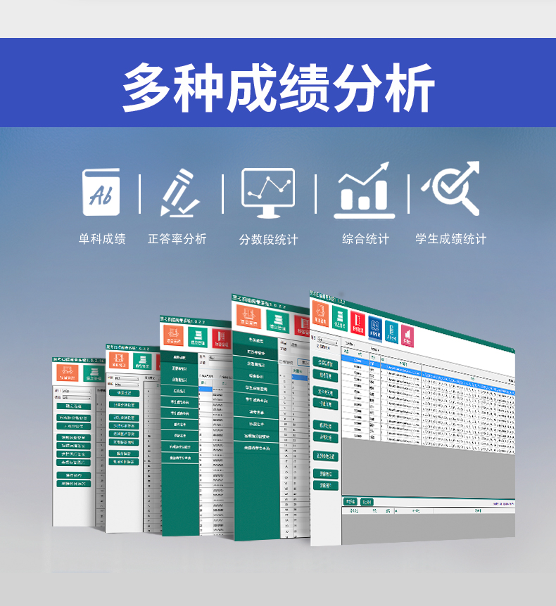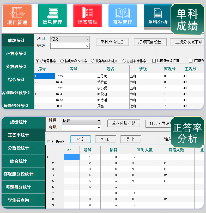 30、具有正答率統(tǒng)計、分題段統(tǒng)計、分?jǐn)?shù)段統(tǒng)計,每題得分、單科成績、多科統(tǒng)計、班級名次、年級名次,缺考違紀(jì)名單統(tǒng)計、歷次成績統(tǒng)計、成績分析等等